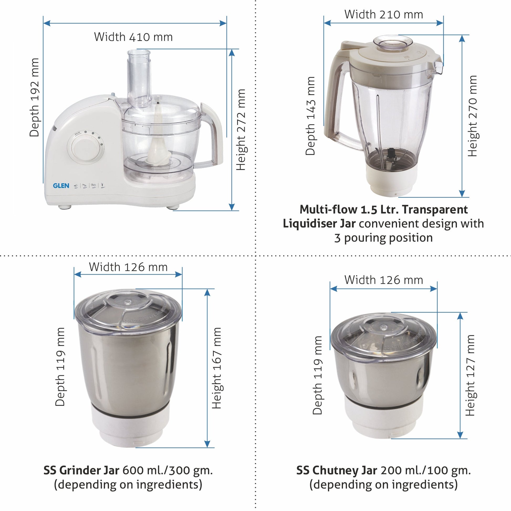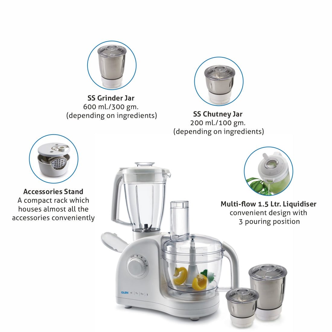 TheB Glen 4052 Food processorB is a complete kitchen machine which performs all the pre-cooking functions effortlessly. It has 3 jars, 6 discs, 1 chopping, 1 kneading blades, a centrifugal juicer and a citrus juicer. It comes with an accessories stand to store all the accessories, fitting into compact storage space. Equipped with special oil seals to prevent any kind of leakage from jars.